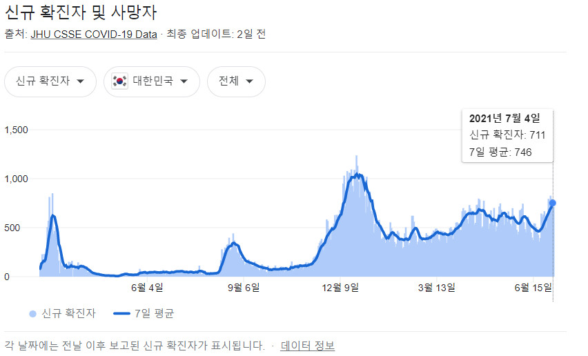 국내 코로나 신규 확진자 역시 일주일 연속 700명 이상을 기록하고 있습니다. 신규확진자가 일주일 연속 700명 이상을 넘었던 것은 12월 중하순 3차 유행 이후 처음입니다. 작년 12월에는 12일 950명이 보고된 뒤 다음달 2일까지 700~1200명대 확진자가 발생하는 등 대유행이 발생했었습니다.