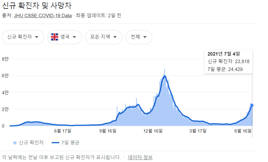 실제로 최근 영국에서는 확진자가 다시 10000명을 넘었는데요. 영국 백신 접종률이 그렇게 높은데도 불구하고 델타 변이로 인한 확진자수가 늘어나고 있습니다. 신규 확진자 중 델타 변이가 90%에 육박한다고 합니다. 참고로 영국은 아스트라제네카를 많이 접종한 나라이며 1차 백신 접종률은 63%, 2차까지 접종 완료한 비율은 50%나 됩니다.