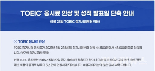 5월23일 정기시험부터 토익 응시료를 48,000원으로 인상할 예정이라고 합니다. 기존 토익 응시료는 45,000원이었습니다. 즉 약 7.8% 인상될 예정입니다. 응시료 인상 배경으로는 지속적인 물가상승과 시험 관련 제반 비용의 증가로 부득이하게 5년만에 인상하게 됐다고 설명했습니다.