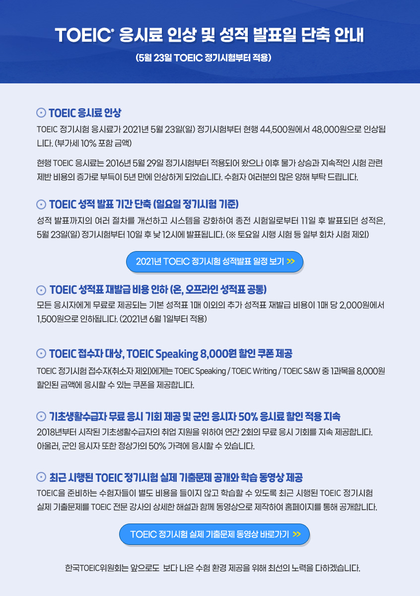 1) 토익 정기시험 응시료 인상 예정(5/23부터) 44,500원 -> 48,000원(부가세 포함)