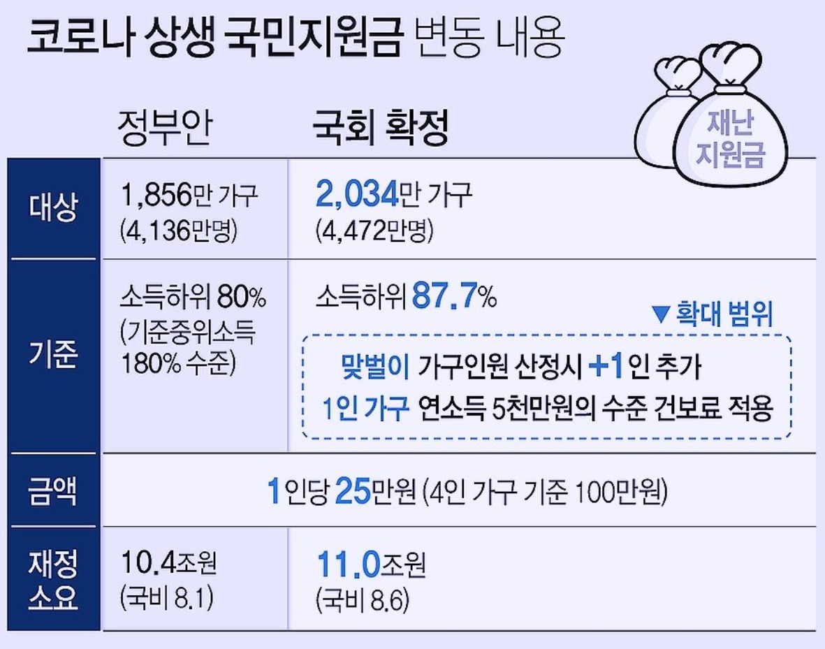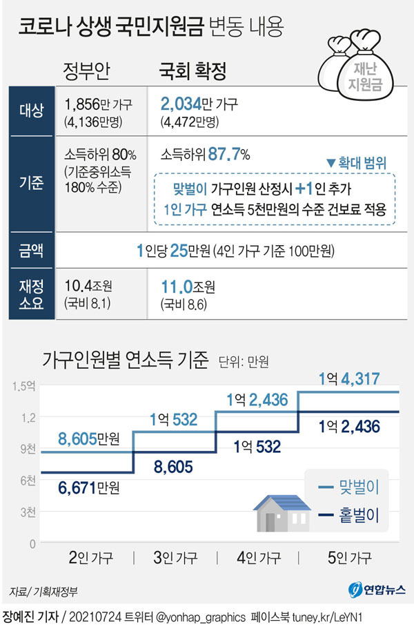 참고로 1년 6개월 가까이 이어진 코로나 충격이 여전한 가운데 5차 긴급재난지원금을 지급하기 위해 편성한 2차 추가경정예산안이 최근 국회를 통과하면서 나온 기준이고요. 작년 코로나가 국내에 발생한 뒤로 6번째 추경이자, 올해 두 번째 추경이네요. 이번에 코로나가 너무 또 극심해지면서 4차 대유행에 따른 피해를 지원하기 위해 국회 심의 과정에서 추경 금액이 1조9000억원 커졌다고 합니다.