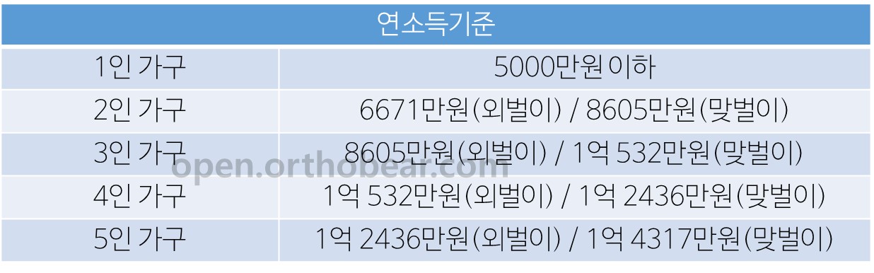 맞벌이 가구의 경우에는 연소득으로 2인 가구는 8,605만 원, 3인 가구는 1억 532만 원, 4인 가구는 1억 2,436만 원으로 아이를 키우면서 맞벌이를 하는 가구의 경우에는 소득이 한 연봉 1억 원 정도를 넘는 분들은 지원금을 못 받는 기준으로 책정된것 같습니다.