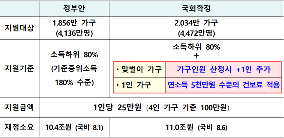 소득 하위 80% 선별 지원을 내세운 정부안과 전 국민 확대를 주장한 여당 사이에서 계속 이렇궁 저렇궁하다가 타협점을 찾았는데요.