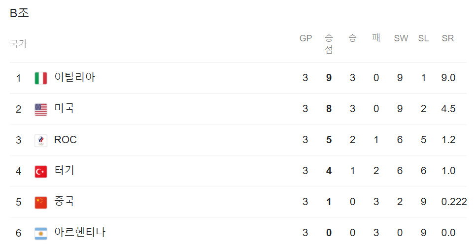도쿄 올림픽 여자 배구 B조 현재 순위는 위와 같습니다.