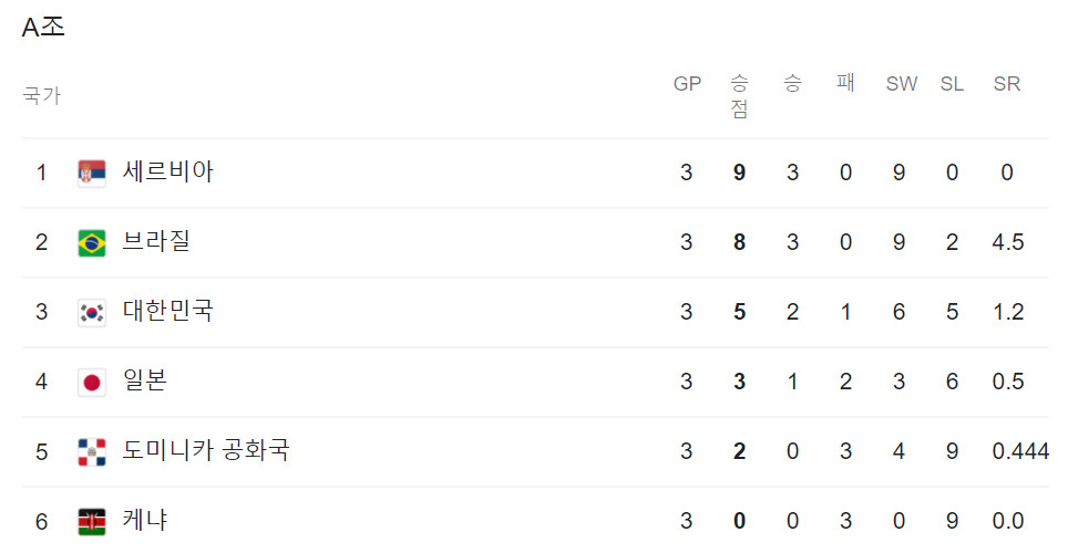 일본은 A조 4위로 우리나라 바로 밑에 있는 상황이고요. 세르비아는 현재 3승을 거두면서 A조 1위를 하고 있는 상황입니다.