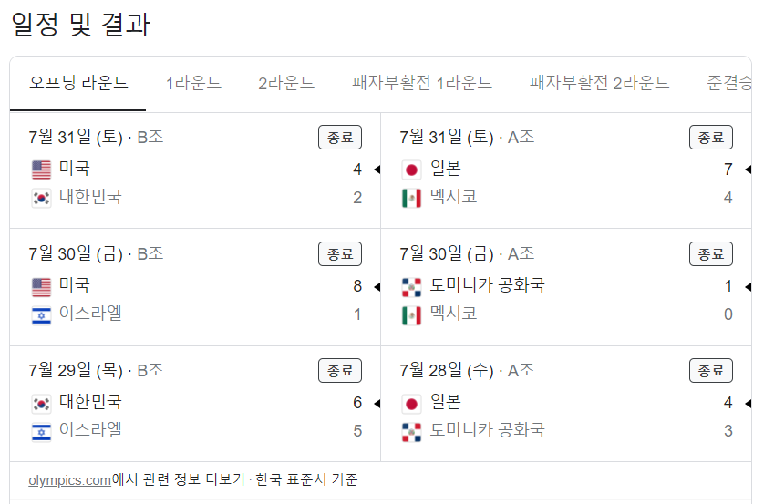 도쿄올림픽 야구 일정 1라운드 결과