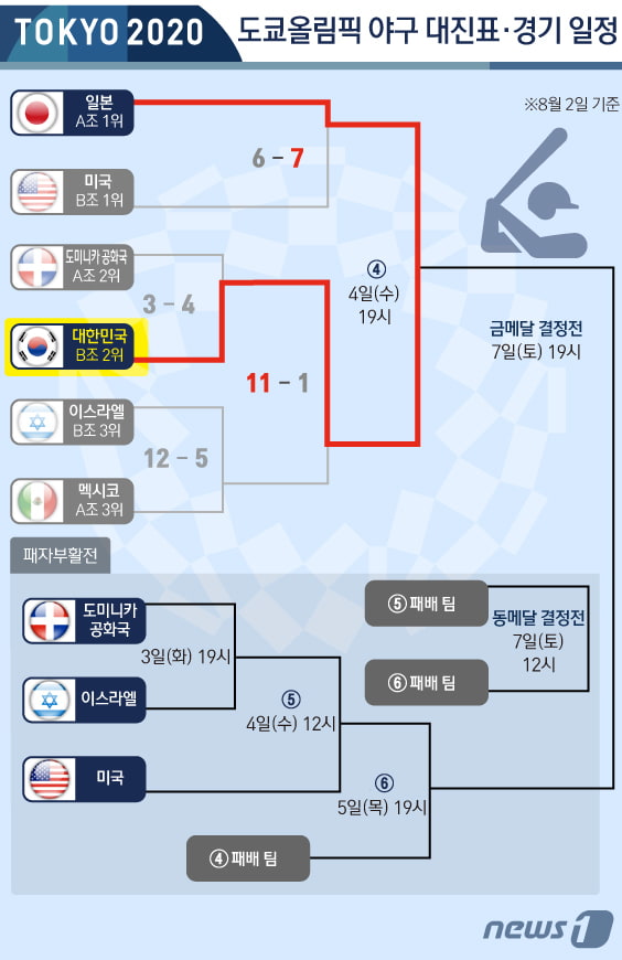 8월 7일(토) 19:00 결승전 (대한민국 : 일본? 미국? 이스라엘? 도미니카?)