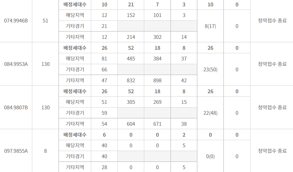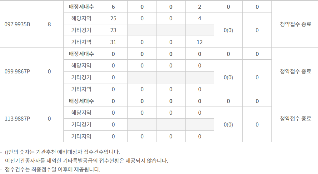 보는법 : 배정세대수가 배정물량이고요. 해당지역, 기타경기, 기타지역이 각각 지원자 수 입니다.