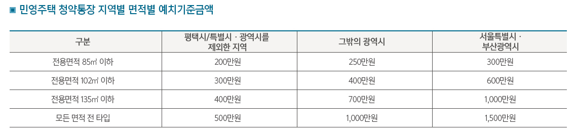 민영주택 청약통장 지역별 면적별 예치금기준금액