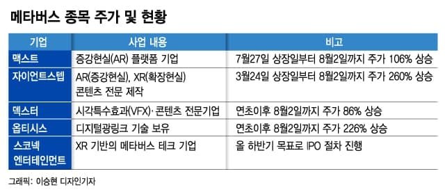 VR(가상현실)·AR(증강현실)·MR(혼합현실) 관련 콘텐츠를 제작하는 위지윅스튜디오와 VFX 기술을 가진 덱스터도 메타버스 관련주로 분류되며 지난달 주가가 두 배 가까이 뛰었습니다.