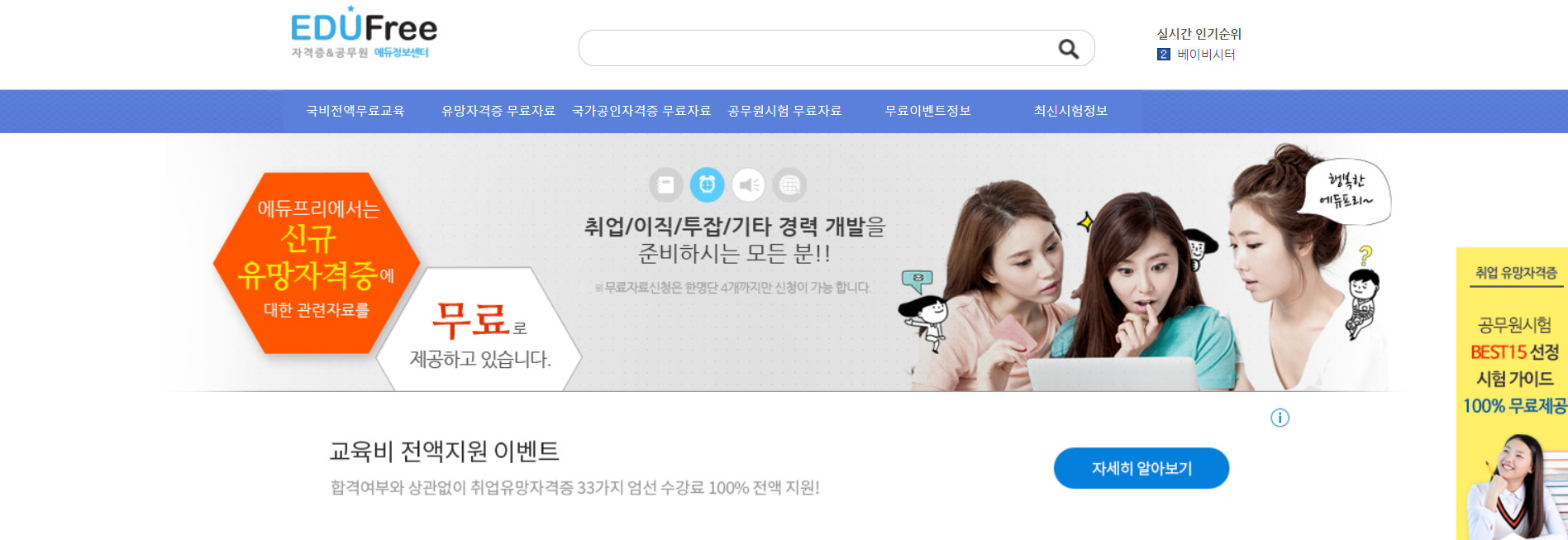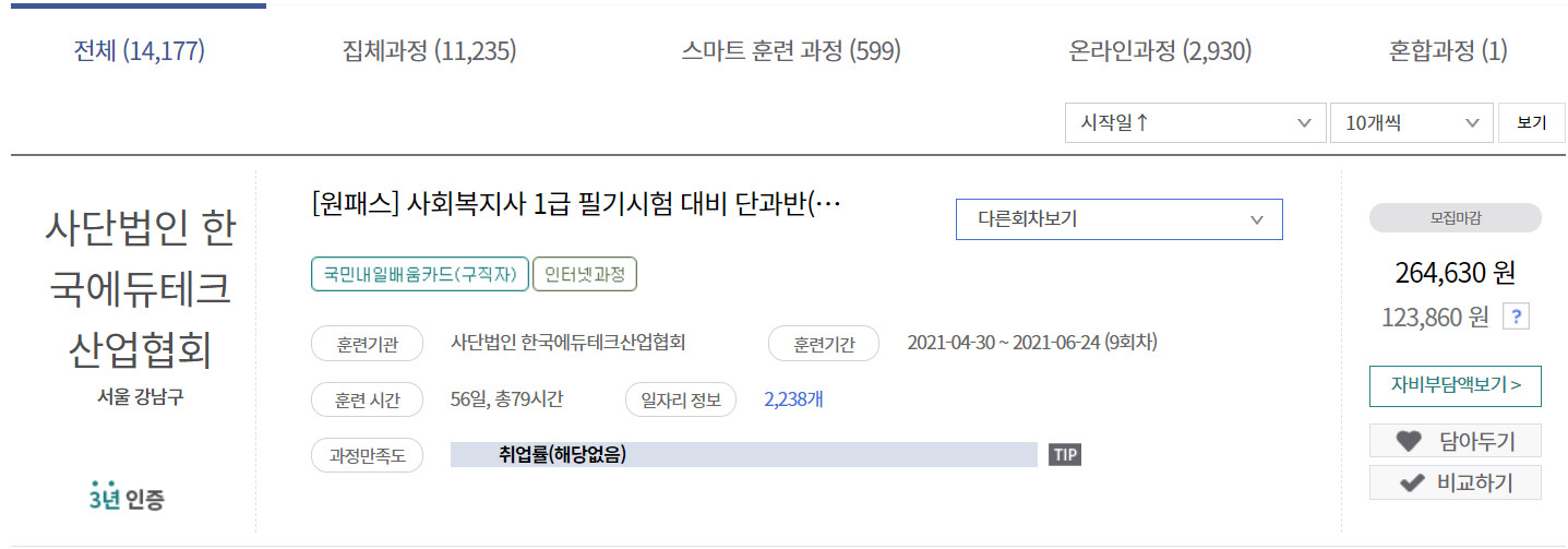 참고로 국비지원 무료교육 검색 사이트는 학원이나 인강 사이트와 같이 민간의 국비지원 교육과정 정보들을 종합해놓은 곳입니다. 이런곳에서 검색해서 원하는 자격증이나 취업과정 등을 선택하는 것도 좋을 것 같습니다.