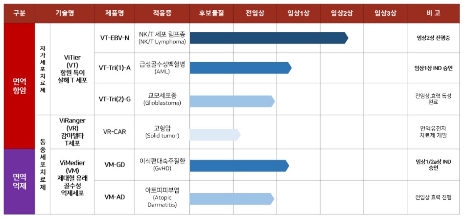 이 가운데 연구속도가 가장 빠른 것은 바이티어(ViTier) 계열의 'VT-EBV-N'란 제품이며, NK/T 세포림프종에 대한 임상시험(2상)을 진행 중입니다. 나머지 플랫폼 기술을 활용한 제품은 이제 막 임상1상에 진입하거나 임상 전(前)단계여서 시간이 필요한 상태입니다.