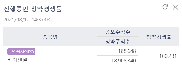 KB증권 바이젠셀 공모주 청약 경쟁률 100.231:1