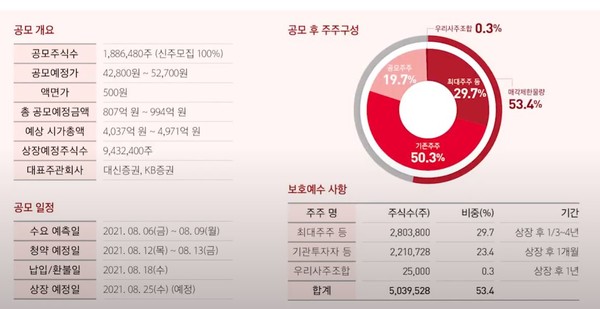 - 총 배정수량 : 188만6480주 (일반투자자 - 47만1620주, 기관 - 138만9860주, 우리사주조합 - 2만5000주)
