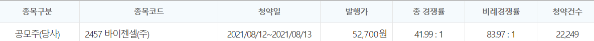 대신증권 바이젠셀 공모주 청약 경쟁률 41.99:1