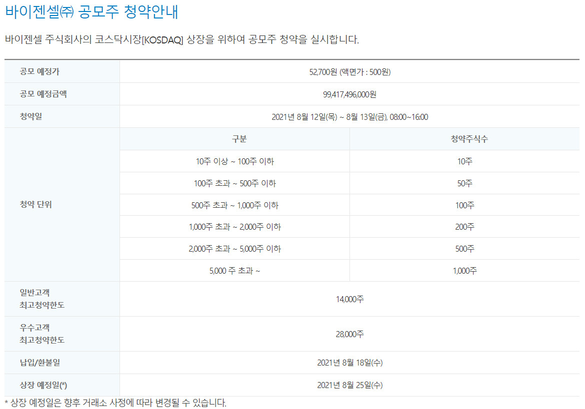 1) 바이젠셀 공모주 청약일 : 8/12~8/13 10:00 ~ 16:00