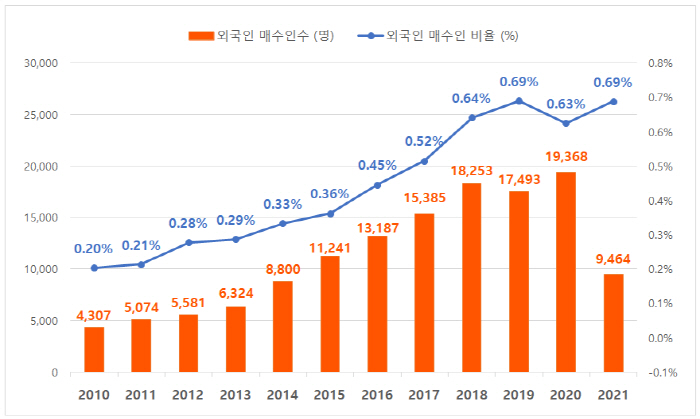 2010년(0.20%) 이후 계속 증가하다 작년 0.63%로 코로나 때문에 잠깐 주춤했으나 매수자 수로보면 19,368명으로 역대 최다였으며 올해 들어 다시 매수자 비율로는 증가세로 돌아섰다고 합니다.