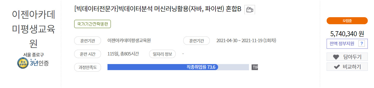 저도 빅데이터 과정을 국비지원 무료교육을 통해 수강한적이 있었는데 생각보다 수업 질도 좋고 취업 연계까지 프로그램이 잘 짜여있었습니다.