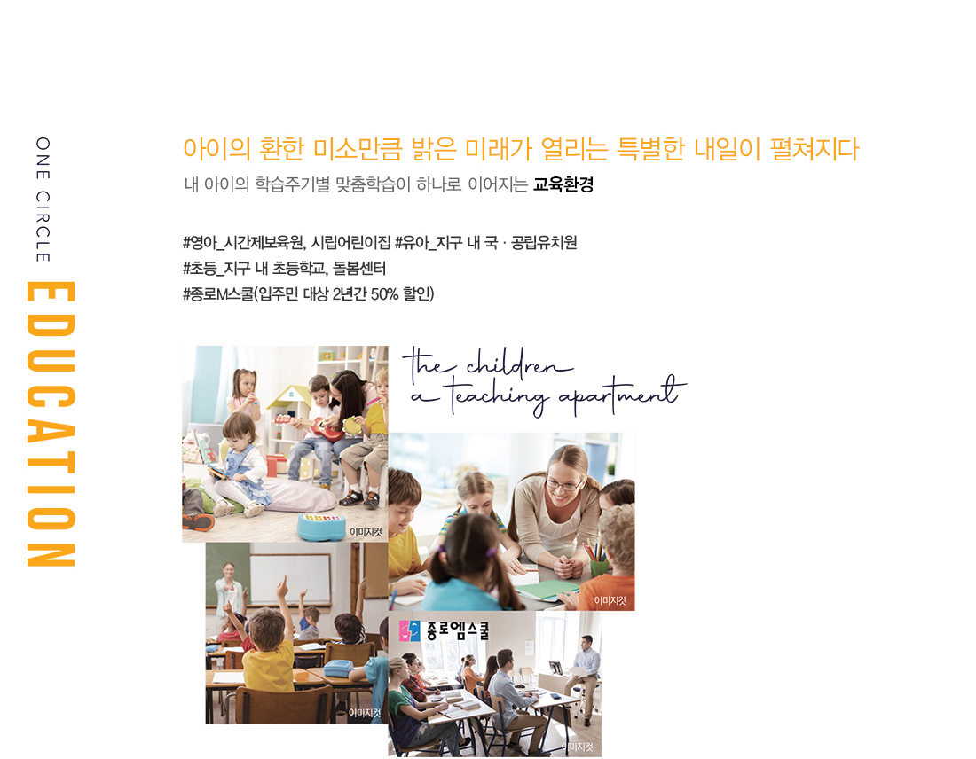 단지내에도 시간제보육실을 포함한 시립어린이집이 들어설 예정이며, 방과 후 초등학생을 위한 다함께 돌봄센터도 만들어진다고 합니다. 맞벌이 가정에서 안심하고 맡길수 있겠죠? 명문학원 중 하나로 소문난 '종로엠스쿨'도 단지내로 들어올 예정이라고 하는데요. 이로써 교육면에서도 괜찮은 입지를 갖출 예정입니다.
