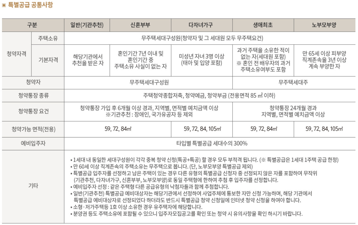 특별공급은 다른곳들과 마찬가지로 일반(기관추천), 신혼부부, 다자녀가구, 생애최초, 노부모부양으로 나뉩니다.