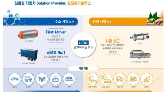 환경사업에서는 미세먼지를 줄이는 배출가스 저감장치를 생산하고 있는데요. 이 분야는 기술진입장벽이 높은 수소사업과 달리 많은 업체가 뛰어들고 있습니다. 다만 일진하이솔루스는 중대형차량 및 동시저감장치 부분에서 점유율이 높은 상태입니다.
