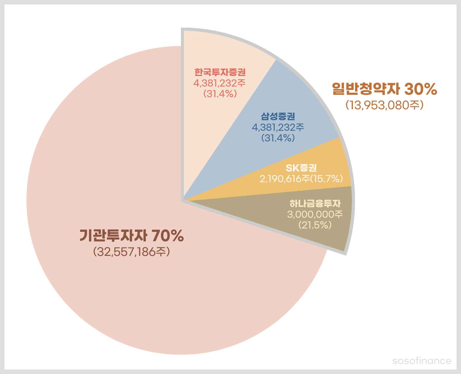 - 한국투자증권 배정수량(31.40%) : 438만1232주 / 청약한도 70만주