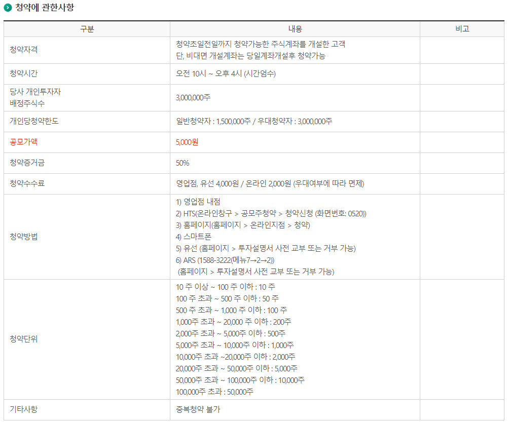- 하나금융투자 배정수량(21.50%) : 300만주 / 청약한도 150만주