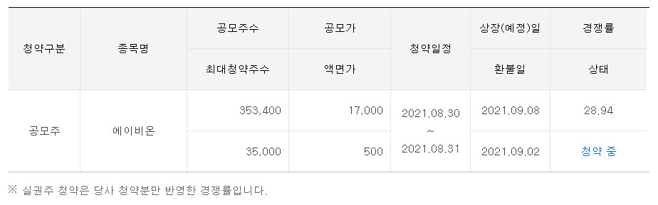 실시간 에이비온 공모주 청약 경쟁률 현황을 확인하실 분은 아래 링크를 통해 확인해보시고 청약하세요.