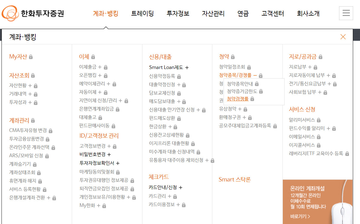 위 링크로 접속 후 상단에 [계좌뱅킹]>[청약]>[청약종목/경쟁률]>[청약경쟁률]을 누르면 한화투자증권 에이비온 공모주 청약 경쟁률을 실시간으로 바로 확인하실 수 있습니다!