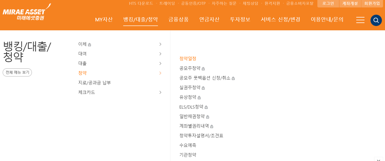 위 링크로 접속 후 상단에 [뱅킹/대출/청약]탭을 누르고 [청약] > [청약일정]을 누르면 미래에셋 에이비온 공모주 청약 경쟁률을 실시간으로 바로 체크할 수 있습니다!